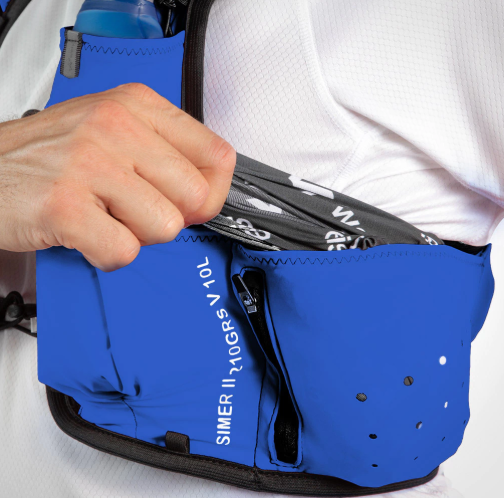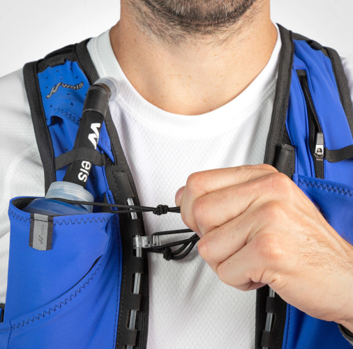 – 2 compartimentos frontales con hangers y portabombillas para botellas blandas tipo soft flask (recomendada), botellas rígidas o caramañolas de hasta 750 ML.